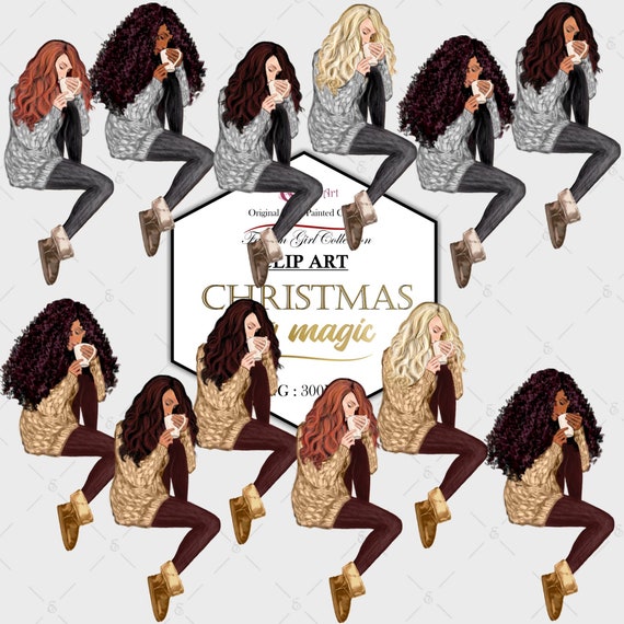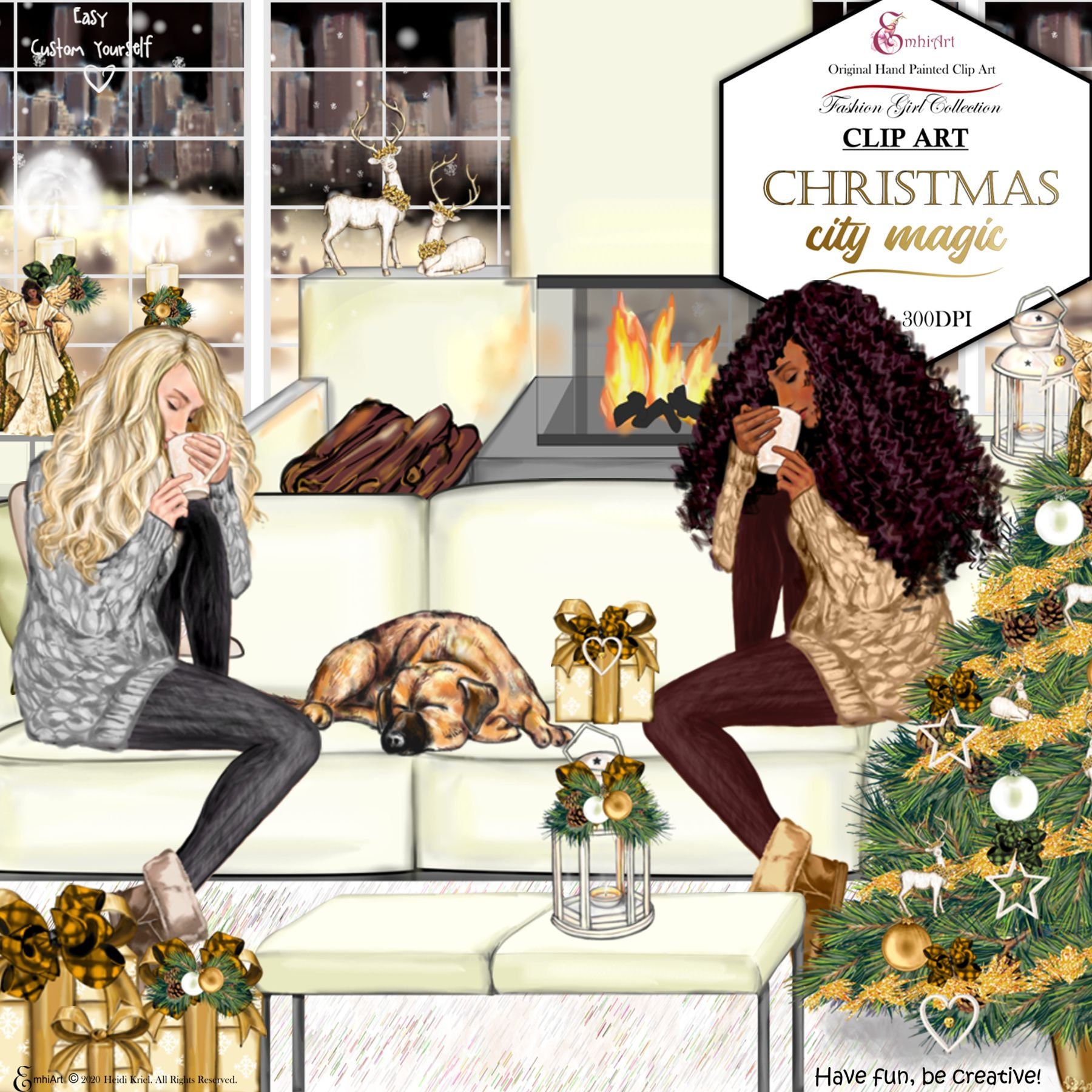 Christmas City Girl Wohnung Szene Schöpfer Clipart Kit.Coffee
